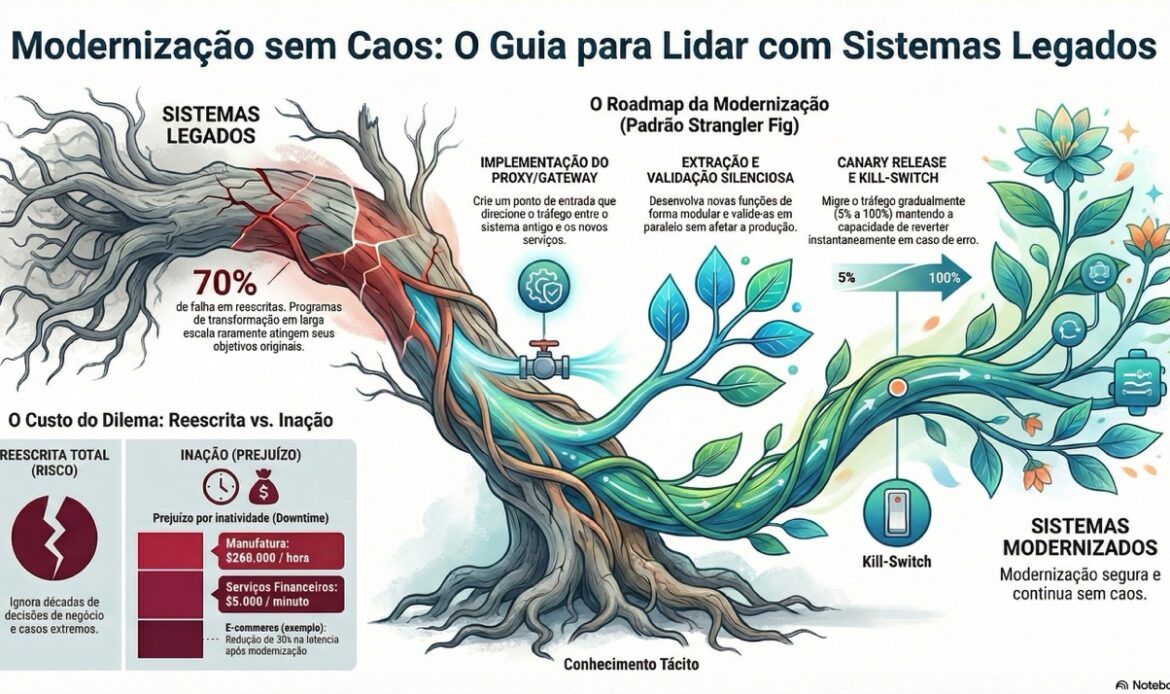 Todo senior em tecnologia chega a um ponto na carreira em que enfrenta um sistema legado que funciona, mas incomoda. É o sistema que paga as contas, que processa transações críticas, que segura clientes importantes—e que, simultaneamente, paralisa a velocidade de inovação. Ele não está quebrado. Exatamente aí mora o problema: não está quebrado o suficiente para justificar um rewrite de 2-3 anos, mas está estável o suficiente para que a organização continue negligenciando-o.