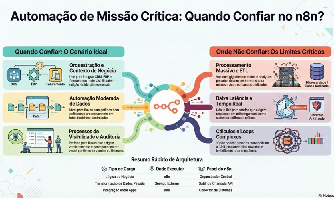 Se a falha ou lentidão do fluxo derruba receita em tempo real ou compromete compliance, o n8n deve orquestrar, não executar o coração do processo.